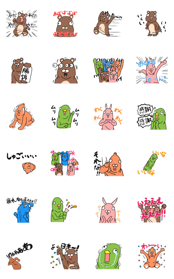 ハイなテンションをさらにハイにする動きが早すぎるスタンプです。ウサギとクマとトリとネズミとよくわからん奴が超ハイスピードで動くため、めっちゃ目が疲れます。