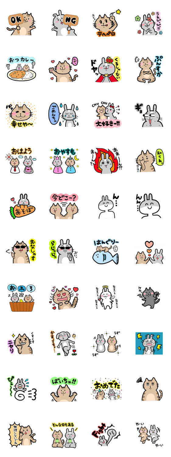 幸せいっぱいの、ねこ&うさぎスタンプ。日常会話で使いやすいスタンプが盛り沢山!あなたをハッピーな気持ちにしちゃいます。レッツ、シェアハピネス!!