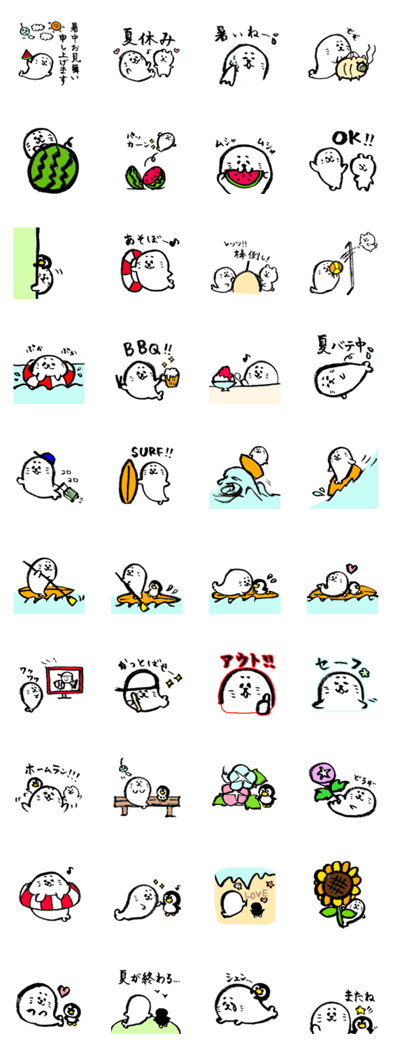 夏の筆ペンアザラシのスタンプです。友達のペンギンと白クマも登場。 白く縁取りしています。