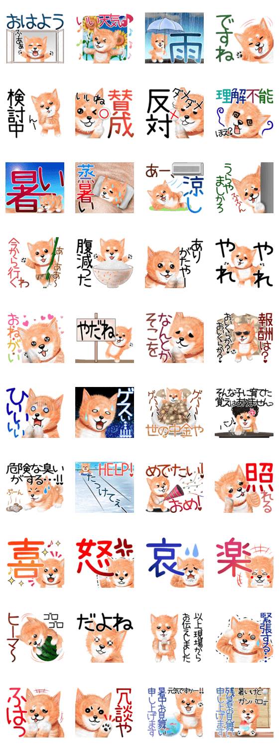 夏向けのイラストが多めのちょっとリアルな柴犬のぬいぐるみ「ぬいしば」のスタンプです。デカ文字のセリフ入りです。