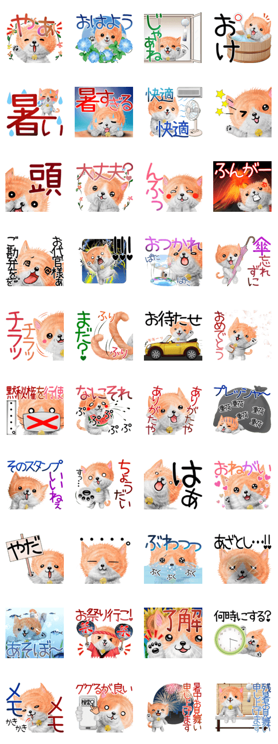夏向けのイラストが多めのちょっとリアルなネコのぬいぐるみ「ねこカワさん」のスタンプです。デカ文字のセリフ入り。