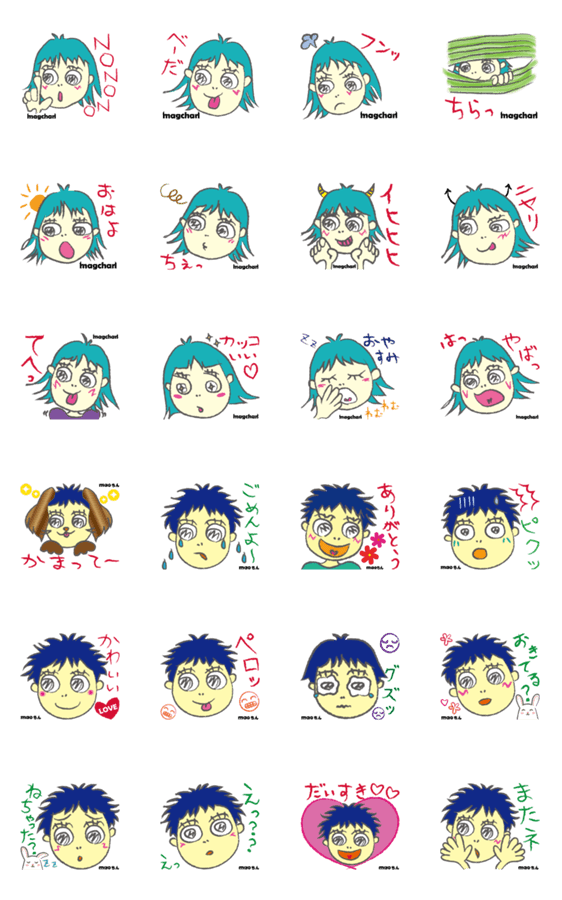 | スタンプ説明 | ちょっとツンツンな女の子magちゃんと気弱な彼氏のmaoちん。家族や友達と楽しく使える定番のあいさつ編です!第2段はmagちゃん、どんどんツンツンになっていきますよッ!! |