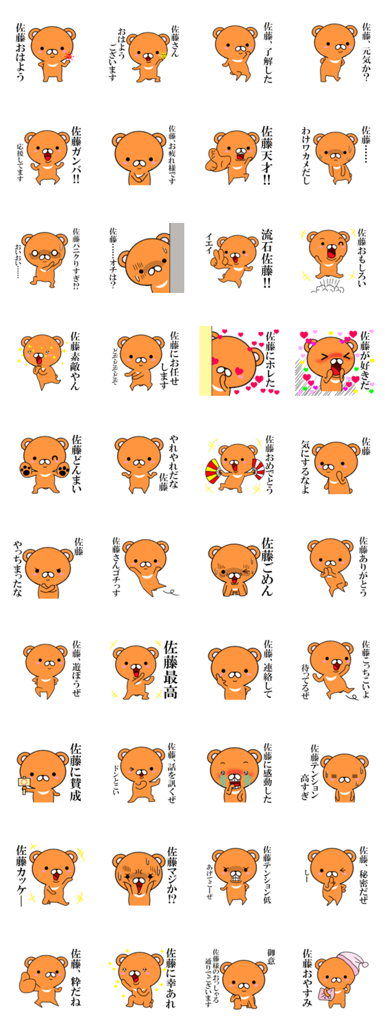 名前をネタにしたクマのスタンプです。佐藤さんの友達や先輩や上司など、佐藤さんの知り合いが使う専用スタンプです。