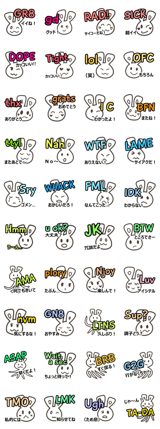 英語圏の人がメールやチャットで使う略語のスタンプです。気軽に使って覚えられるように日本語訳も付けました。楽しみながら英語の略語も身につけちゃいましょう!