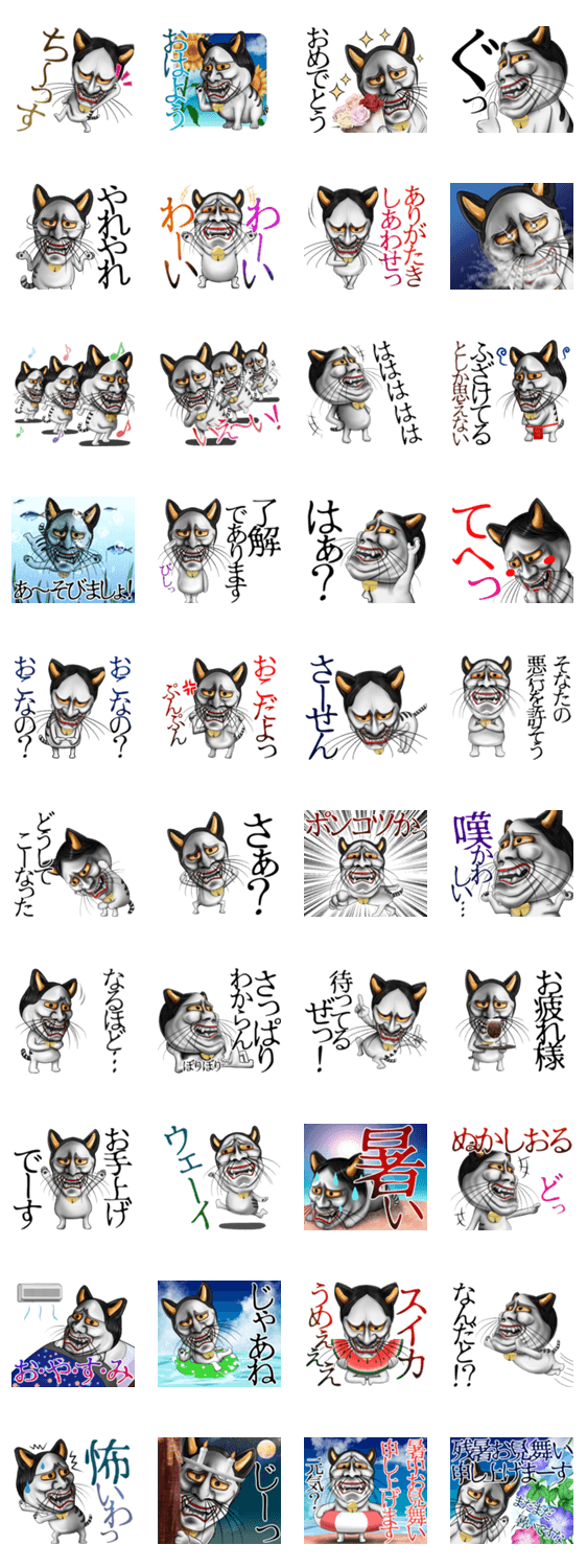 般若の顔で生まれてきてしまった猫のスタンプ。年中使えますが、夏成分ちょっと多めです。いつも笑顔で頑張ります!