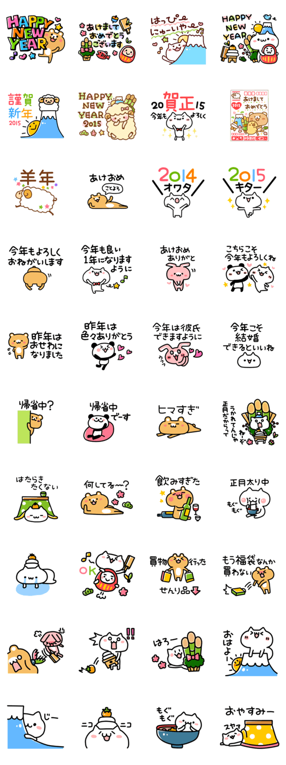 Happy new year、あけましておめでとうございます、今年もよろしくなどの年始の挨拶や、お正月に使える日常会話のスタンプだよ♪