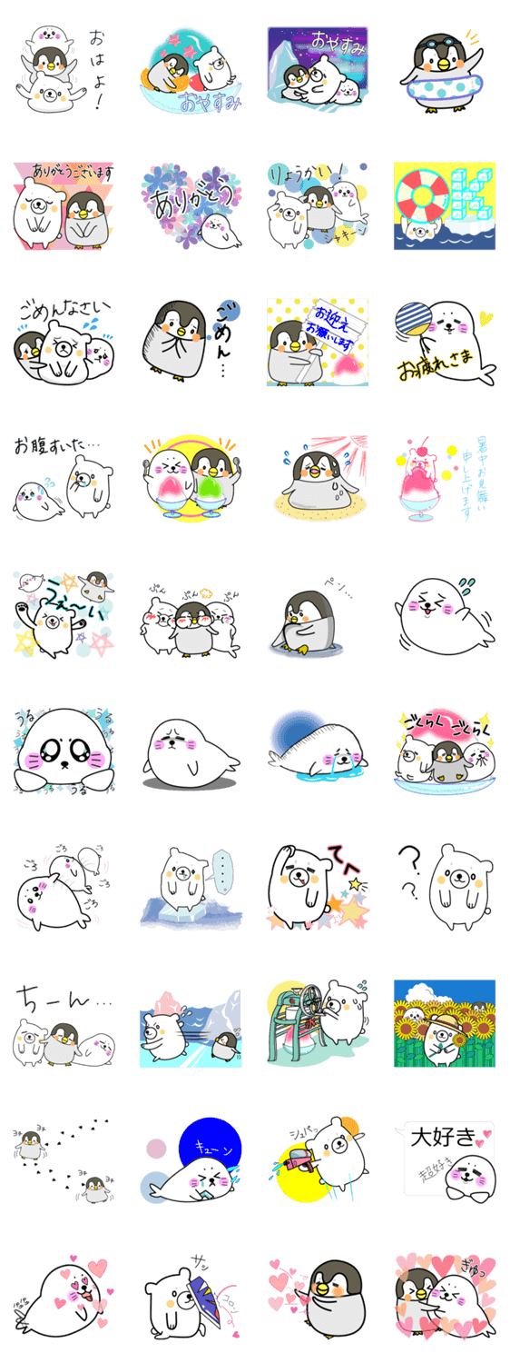 ホッキョクに暮らしている仲良し三人組の夏にぴったりなスタンプです。 ペンギン、シロクマ、アザラシ、かき氷、夏、かわいい