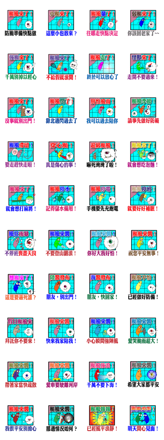 | スタンプ説明 | Typhoon is coming! We can use this sticker to convey a message! Now buy the sticker, when the typhoon hit, remind friends attention to safety! |