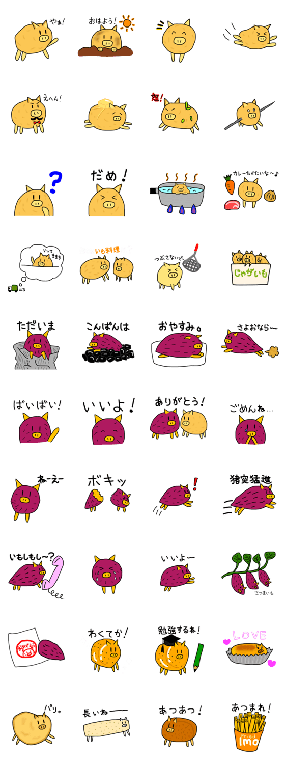 | スタンプ説明 | 「芋」と「いのしし」のキャラクター、いもししくんのスタンプです。 じゃがいもししくん、さつまいもししくんなどの種類があります。 |