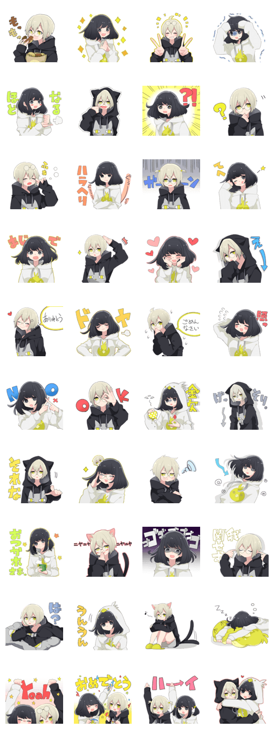 猫パーカーと小鳥パーカーの女の子がわちゃわちゃしてるスタンプです