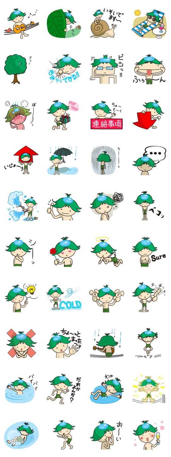 | スタンプ説明 | ポッタン星人の日常は平凡。覚え立ての仕草やコトバの基本をスタンプに。 ポッタンは地球に雨を降らせにきました。雨上がりの電線や木の下に滴を落とすのは彼のイタズラ。 |