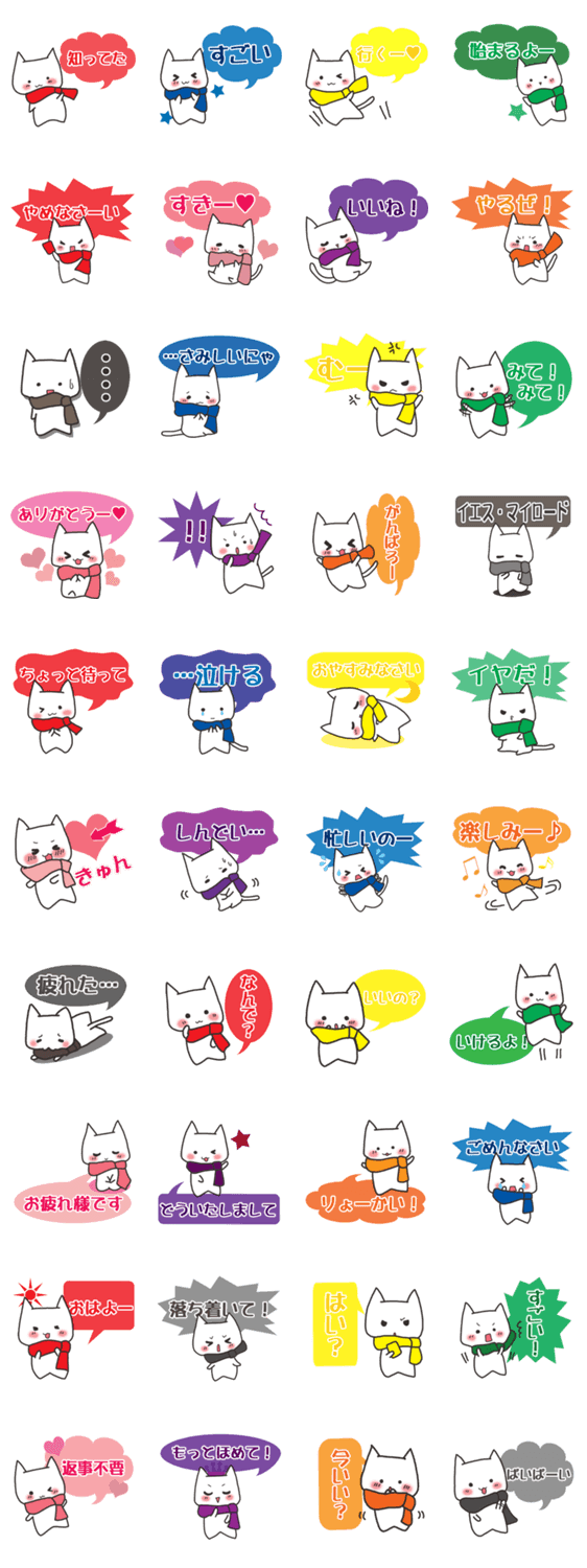 マフラーにゃんこの第2弾!今回のマフラーはいろんな色、セリフも色に合わせて作りました。カラフルな猫のスタンプです。