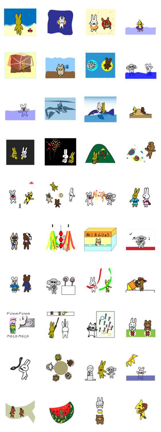 うさぎ、くま、きつね、りす、あらいぐま、しか、きりん、かば、ぶた、ぞう等のスタンプです。