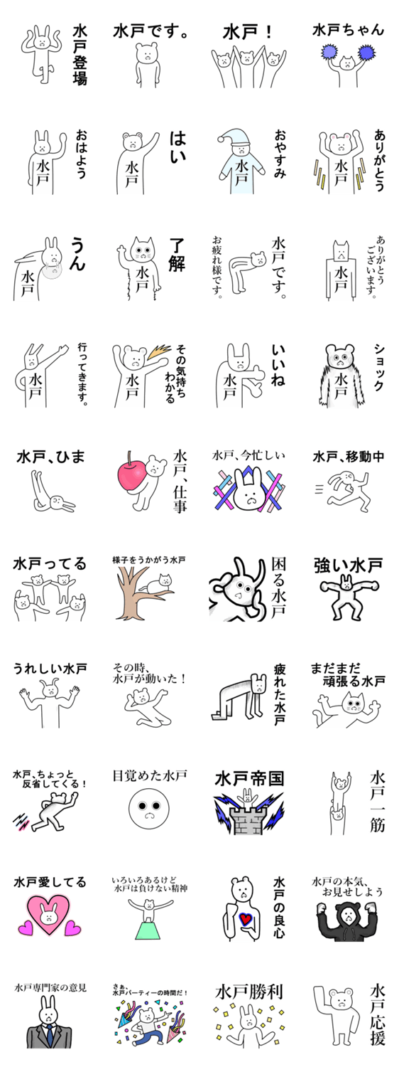 | スタンプ説明 | 日本全国の水戸さんが日常会話に使えるスタンプ&お友達お知り合いの水戸さんに向けて送るスタンプです。水戸(みと、みずと、みずべ)さんスタンプ |