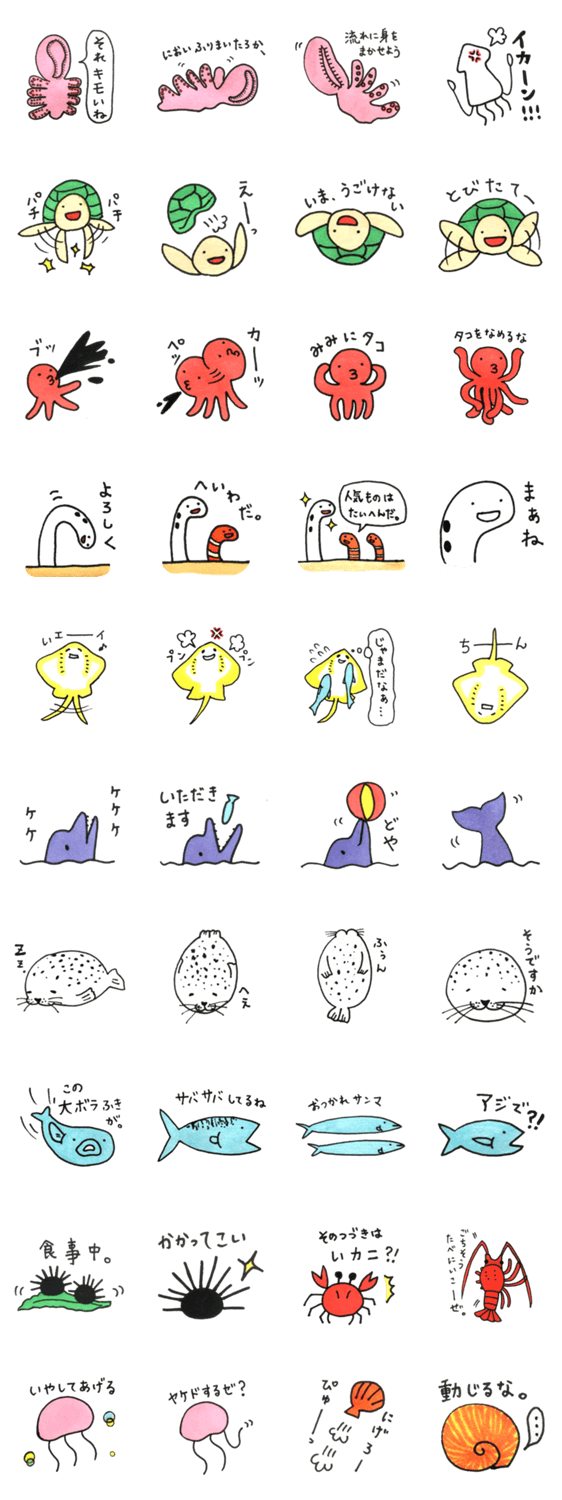 海の生き物を集めました。ヤマトメリべやウミガメ、チンアナゴ、アカエイなど、水族館の人気者をゆる〜くお楽しみください。