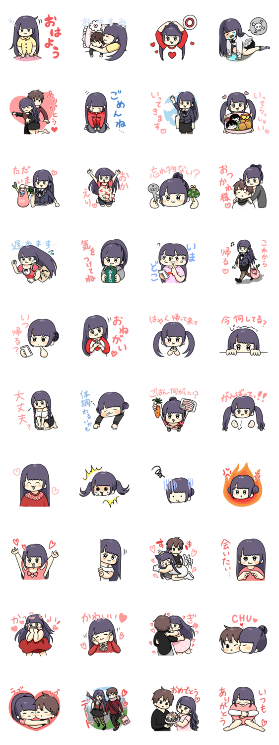 彼女用カップルスタンプ第一弾は、挨拶からお返事まで色々と使いやすい日常系! 彼氏用と一緒に使えば楽しく会話ができます! 黒髪ぱっつんの天然彼女と茶髪のクール彼氏!
