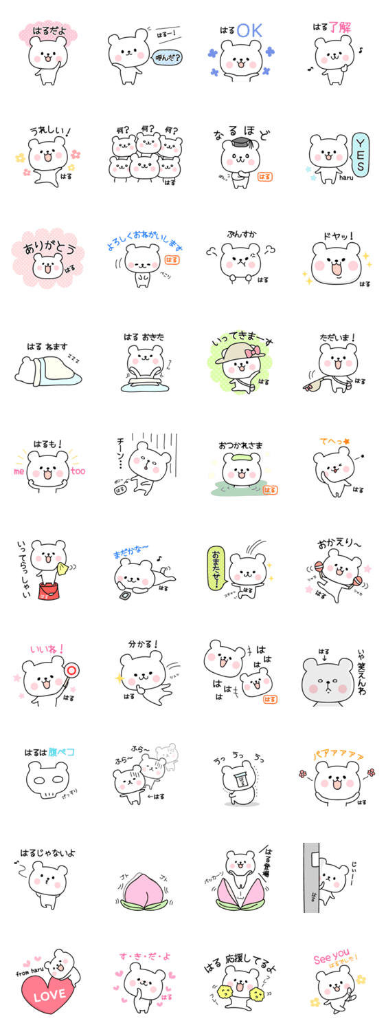 はる、はるか、はるな、はるみ、はるこ、はるえ、はるよなど「はるちゃん」専用のスタンプです。友達や家族、彼氏に名前入りでメッセージを伝えよう。