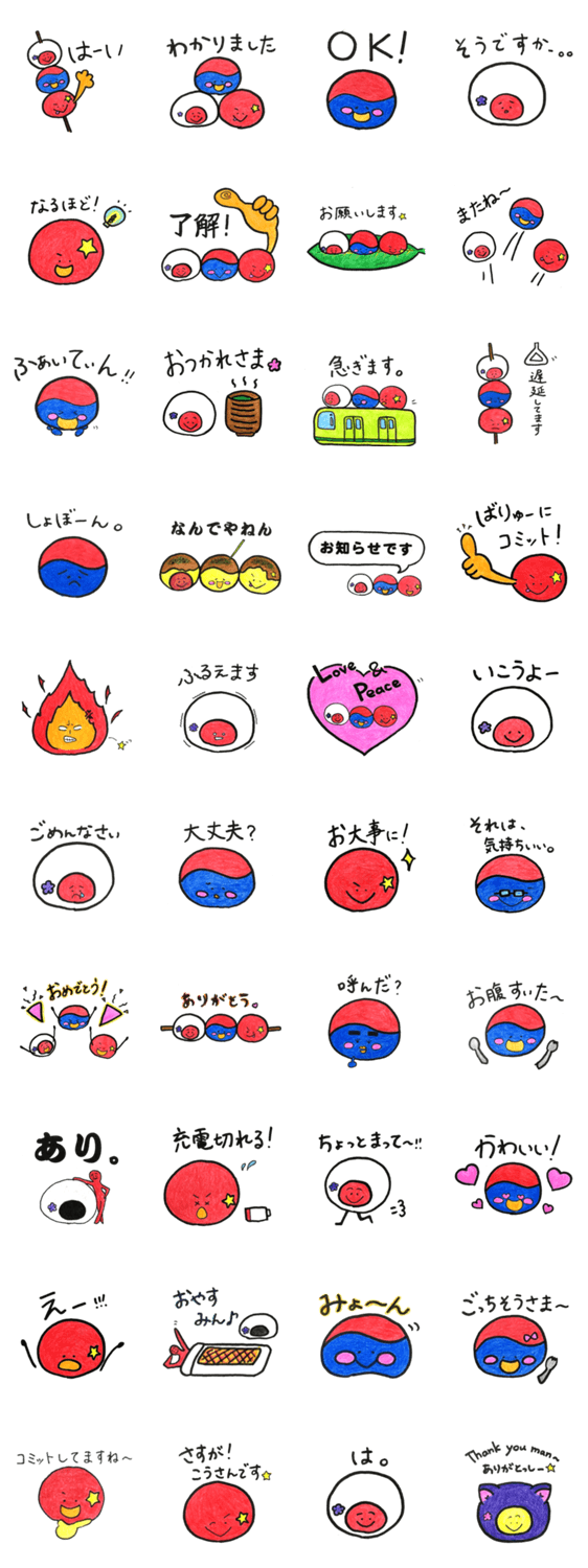 | スタンプ説明 | 東アジアの友好を願う三兄弟、ジャパだんご、コリだんご、チャイだんご。特技は順にジョギング、大食い、ラジオ体操。毎日平和に生きてます。 |