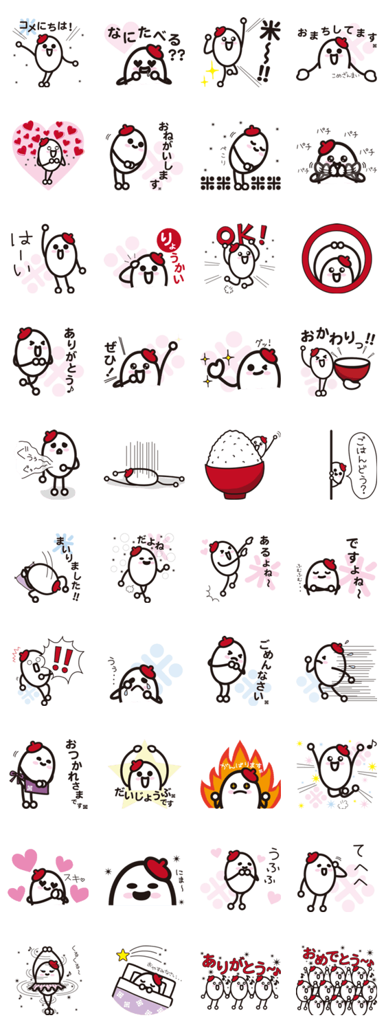 お米の妖精おこめちゃんはコーラスグループCometsのメンバー。腹ぺこな時にも、そうでない時にも使えるスタンプです♪