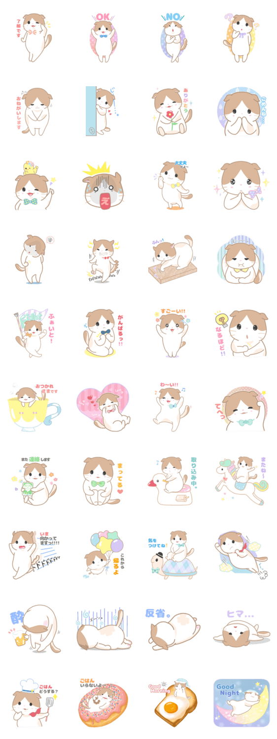 スコティッシュフォールドのほんわかとしたスタンプです。日常よく使う言葉を中心に。家族、友人、職場の人に送ってあげて下さい♪
