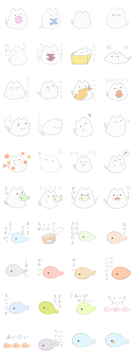 おもちみたいなまっしろのねこ「おもちねこ」と、カラフルなさかなたちのスタンプです。 友達、家族、恋人とのLINEに添えて、かわいいキャラたちから癒やしを感じてね。