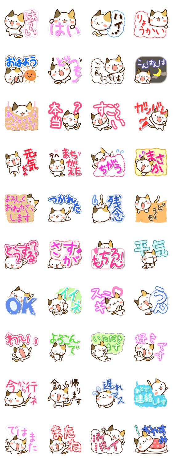 おちゃめで可愛い三毛猫。簡単な返事をするときに便利なスタンプです。ネコキャラ好きの方、ねこを飼っている方、ぜひ可愛がってください。【かたこスタンプ】