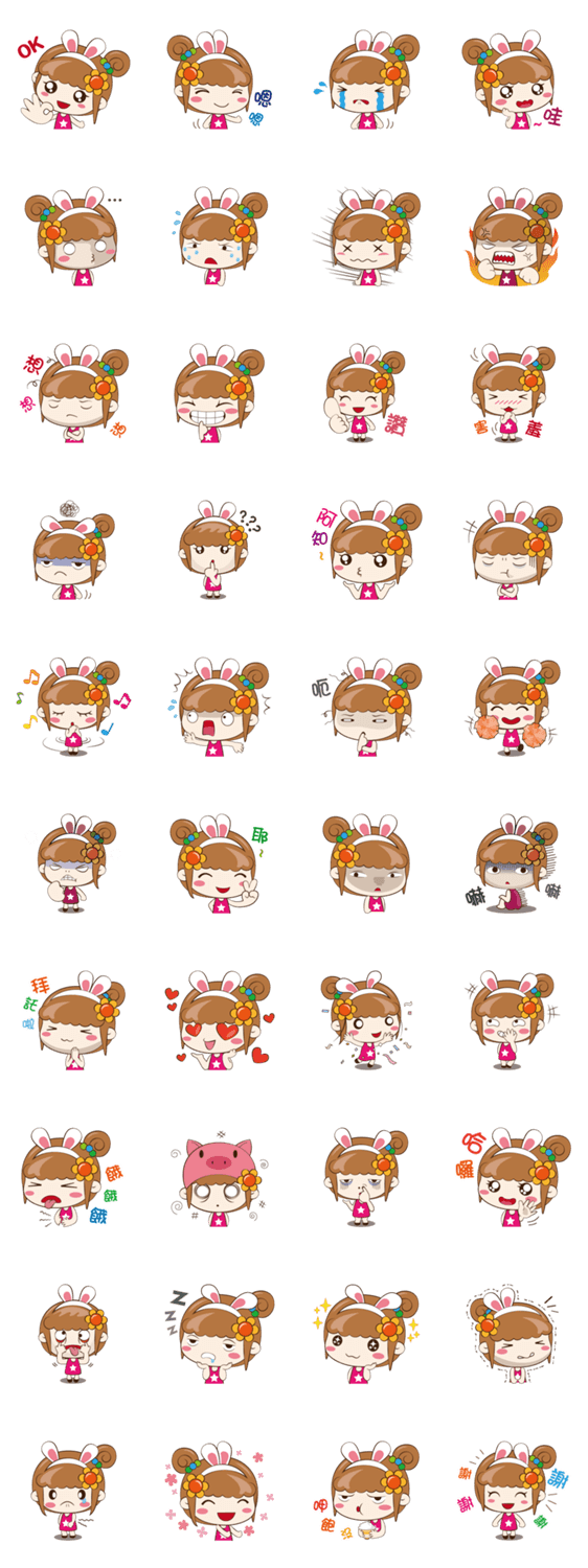 | スタンプ説明 | A cute rabbit baby girl, always wearing her favorite hair bands of rabbit ears , express her emotions in everyday life. |