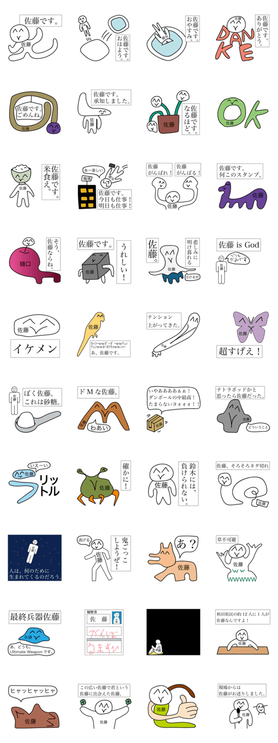 | スタンプ説明 | 前衛的な佐藤のスタンプです。いろいろ不安定です。全国のさとうさん、誠に申し訳ございません。 |