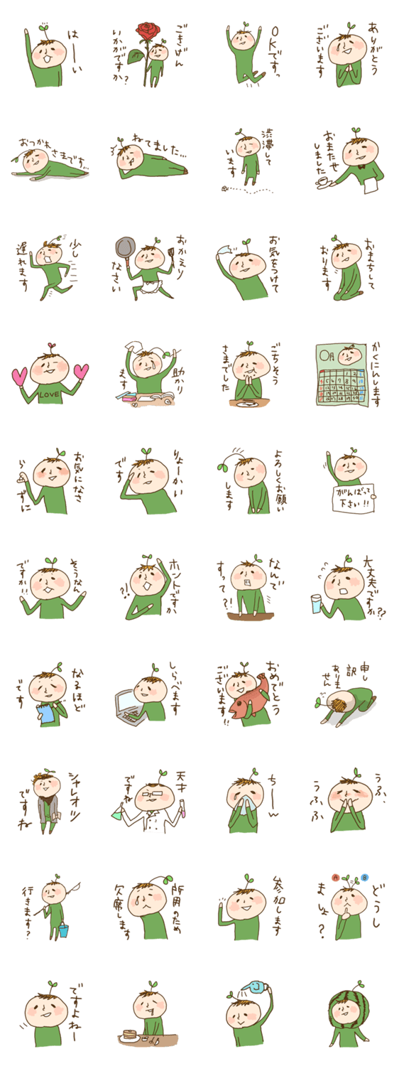頭から芽の生えた「スプラウトさん」のゆるい日常の敬語スタンプ