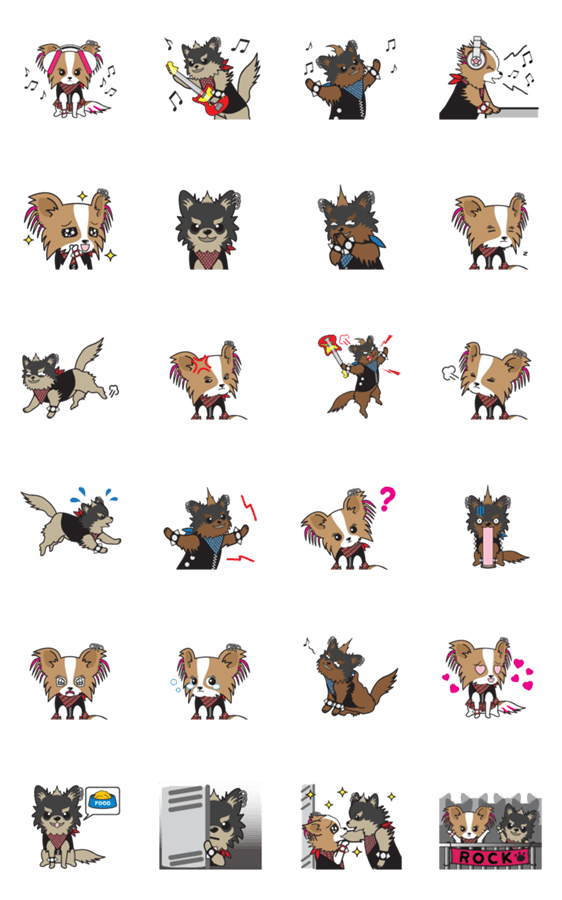 ロック好きのワンちゃんをかわいいスタイルで表現した、実用さとユーモアを兼ねるスタンプです。仲の良い人や大切な人を共有しよう!
