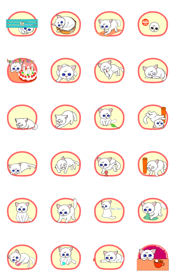会話や周りに無頓着な猫の仕草をスタンプにしました。 話の途中にホットする猫の動きを入れることで 会話の潤滑油になればと思い作成しました。