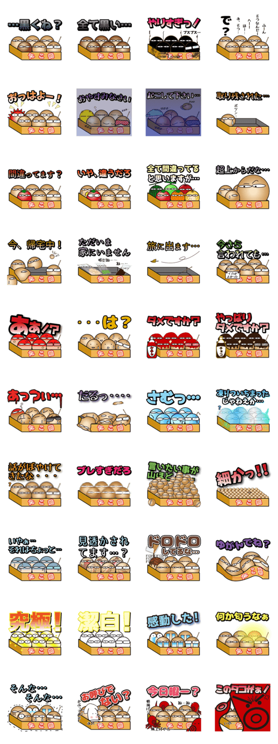 | スタンプ説明 | たこ焼きにだって気持ちはあります(多分…)。 それは人間と同じように(多…分…)。 色んな気持ちのたこ焼き達を作ってみました。 是非ご賞味を。 |