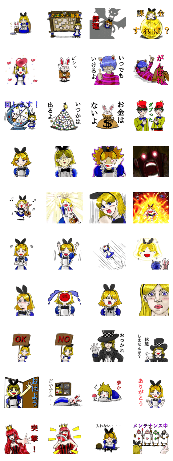 アリスと愉快な仲間達がオンライン携帯ゲームをしているスタンプ。貴方も喜怒哀楽をアリスと一緒に友達に送ってあげよう!