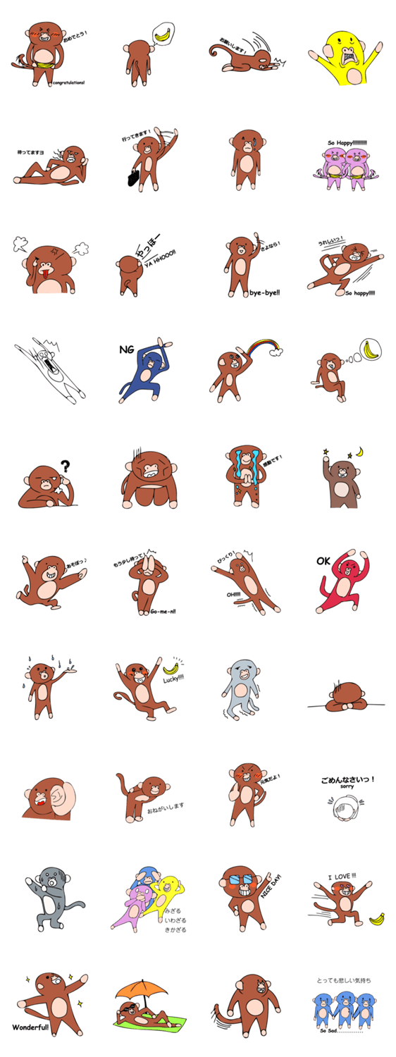 | スタンプ説明 | 素直なサルの気持ち。嬉しい!悲しい、困った時…正直サルのスタンプでもりあげて盛り上げて(盛り下げて?)下さい。あなたもサル使いに。 |