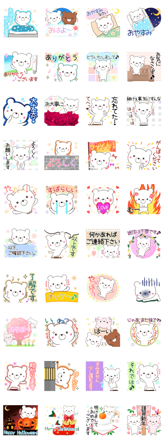 つぶらな四角の瞳のゆるいクマのスタンプです。友達用と目上の方用の敬語を全体の半々ぐらいの他、ハロウィン,クリスマス,年賀状等の挨拶等も入れてます。