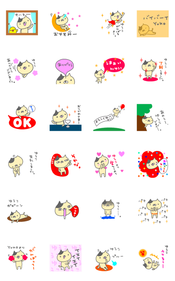 「ゆうこ」「YUKO」の名前入りスタンプです。家族・恋人・友達へ署名入りのスタンプを送ってみてはいかがでしょうか。ネコがかわいく動きますよ~。