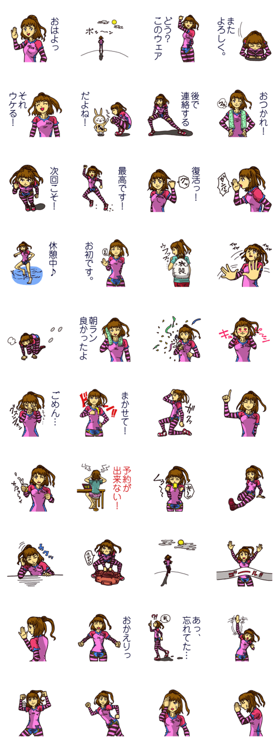 | スタンプ説明 | ランニングをしている際の出来事をスタンプにしました。日々の出来事を、ランニングを通して表現してみると、普段とは違った会話を楽しむ事が出来ます! |