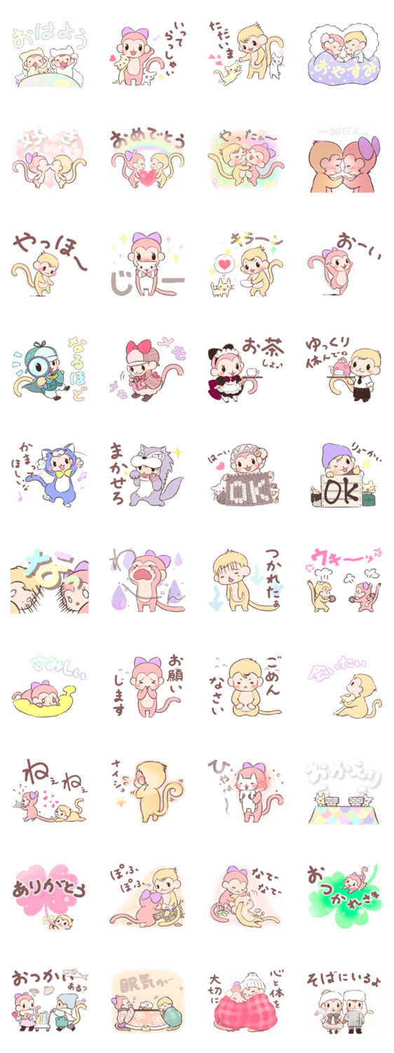 | スタンプ説明 | 猫と暮らしているおさるさんのスタンプです。探偵、気ぐるみ、メイドなどなど |