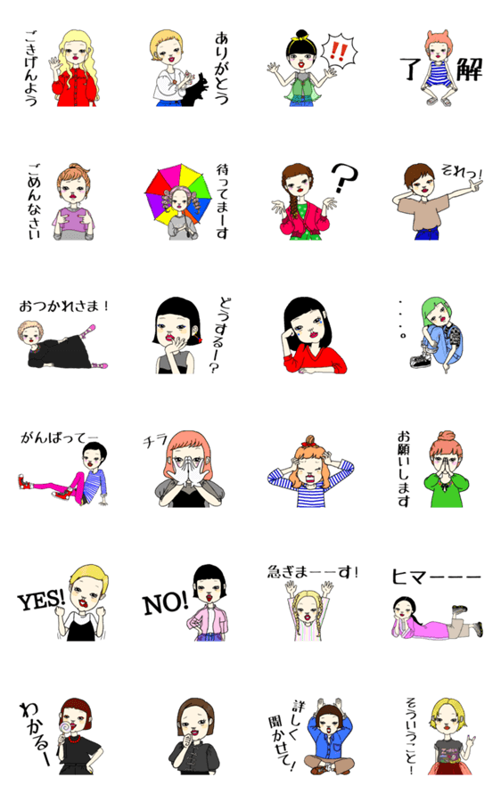 ひかえめに動くよ!おしゃれ好き必見。カラフルでキュートな女の子たちが想いを伝えるスタンプです。