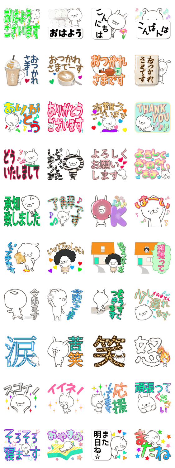 デカ文字のバラエティーパックです。よく使う、おはよう、お疲れ様、ありがとうが多めで、その他、どういたしまして、よろしく、了解、頑張って、など(吹き出し入り♪)