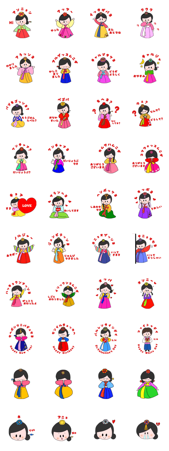 カタカナで韓国語のチマチョゴリ編です。チマチョゴリを着た女の子の可愛いスタンプです。K-POP 韓流が好きな方、日本語で気軽に韓国語のスタンプを使いたい方におすすめ!