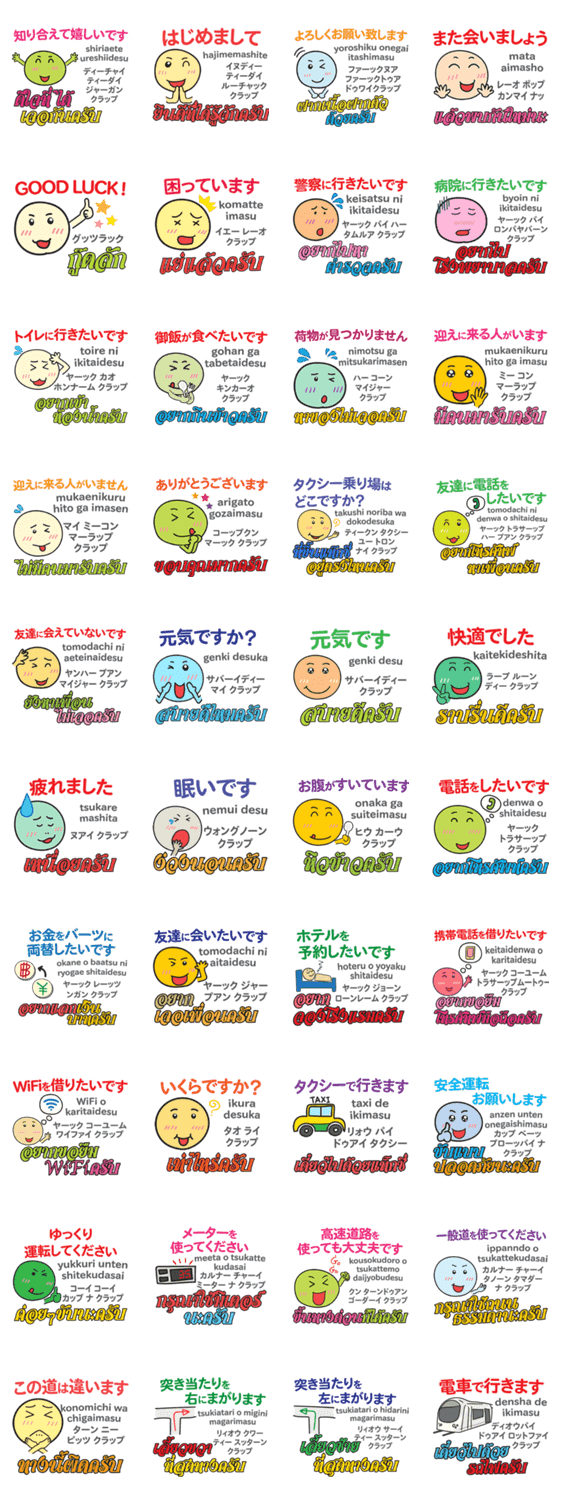 | スタンプ説明 | タイ語と日本語で楽しみましょう。タイ人と日本人が会話でよく使う旅行の言葉。ワンプッシュで円滑なコミュニケーション。タイ人と日本人が仲良くなるスタンプです。 |