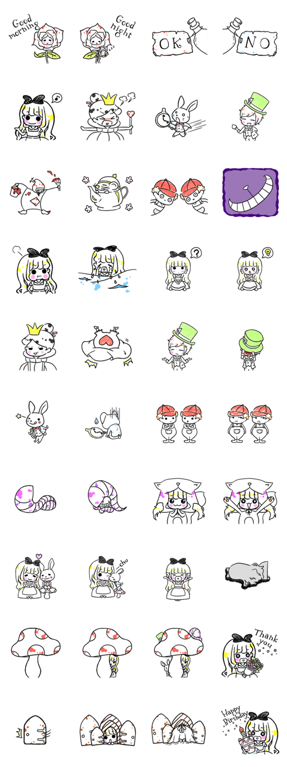 白ベースにドット柄のアリスや白うさぎ、トランプ、ハートの女王、いかれ帽子屋(マッドハター)、チシャ猫と不思議の国の様々な住民のスタンプです。