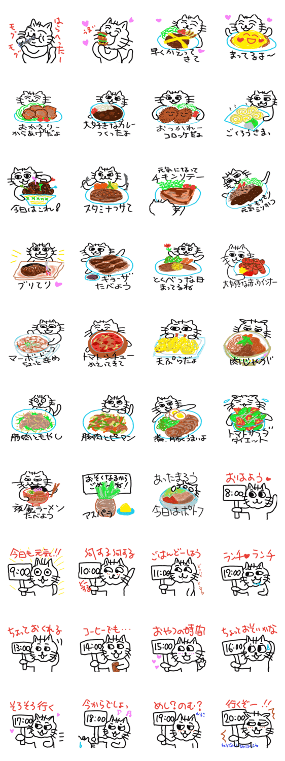 ねこと料理と時計のスタンプです。毎日使える!!