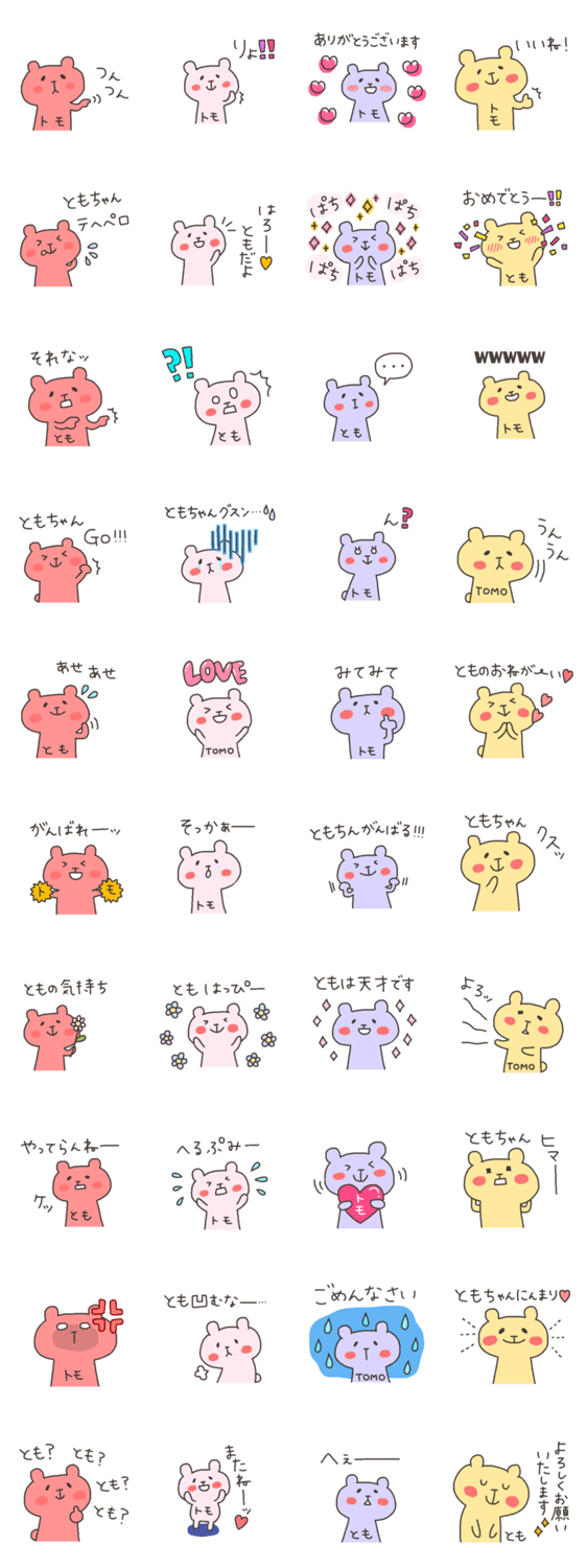 ともちゃん、ともかちゃん、ともこちゃん、ともみちゃん、ともよちゃん、ともきくん、ともひろくん、ともやくん…全国の「ともちゃん」「ともくん」専用のスタンプです。