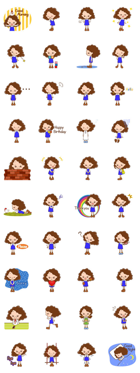 もこもこくせっ毛の女の子『レイニー』と、なかよしのニワトリ『クルボー』のスタンプです。