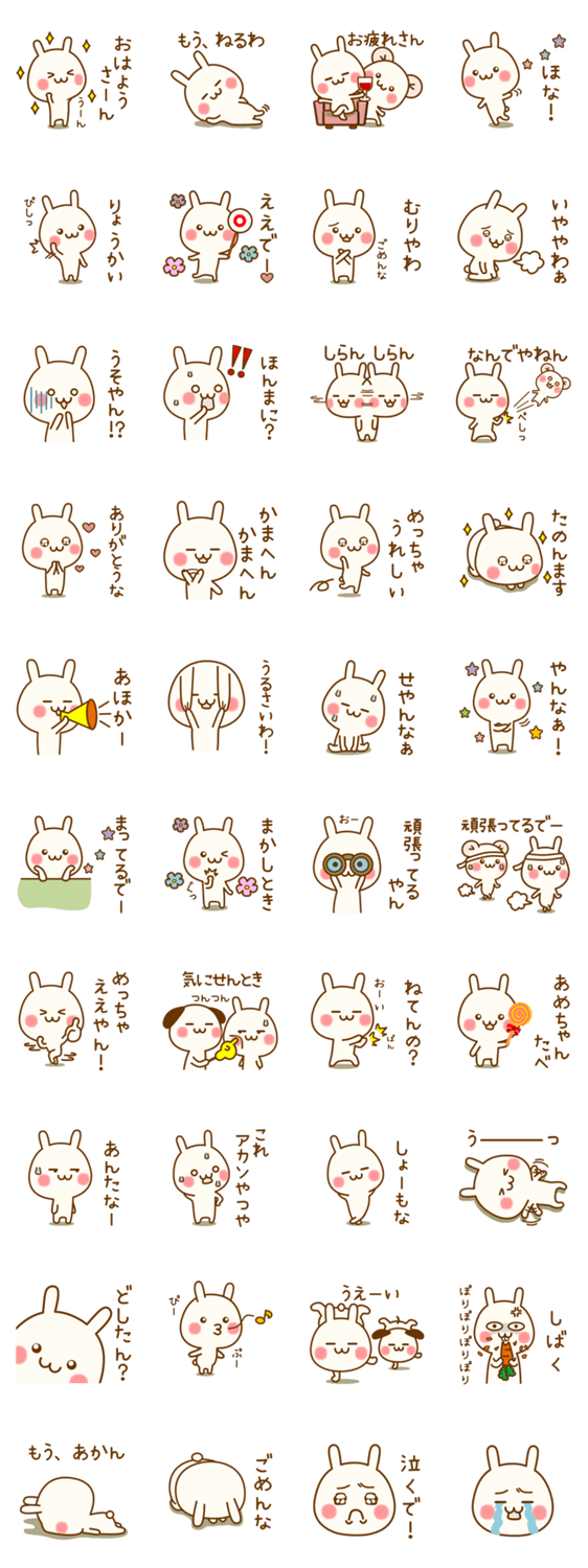 うちのウサギ『関西弁編』はかわいいウサギの関西弁のスタンプです。よく使う言葉を集めました。毎日の会話にどうぞ。うちのハムとイヌも登場します。