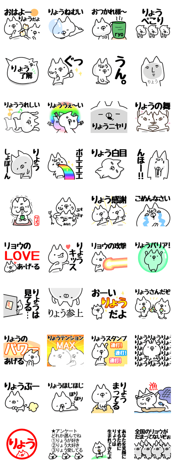 りょう、ちゃん、さん、君(くん)が使える、ゆるい名前/あだ名スタンプ。リョウ/りょうた/りょうま/りょうへい/りょうこ/りょうか/りょうな/りょう専用ねこ。送ると面白い。