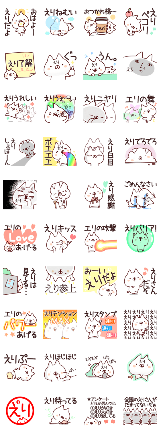 えり、ちゃん、さん、が使える、ゆるい名前/あだ名スタンプ。エリ/eri/えりか/えりこ/えりな/えみり/えりみ/ちえり/エリー/えりの/えり専用可愛い、ねこ。送ると面白い。