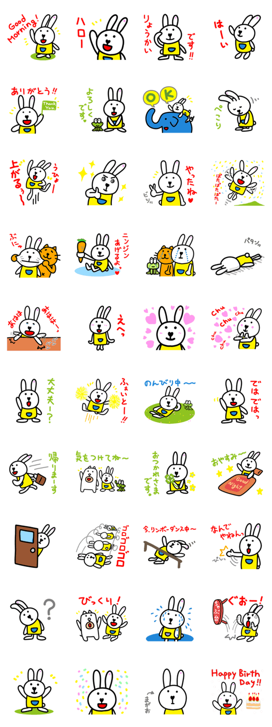 うさぎのメルシー。大きめ文字で毎日使える言葉 & ゆるくて楽しいスタンプがいっぱい!かっこいい犬もっちー、ネコのクッキー、カエルの塩ぴょんも登場。画:田辺誠一/俳優